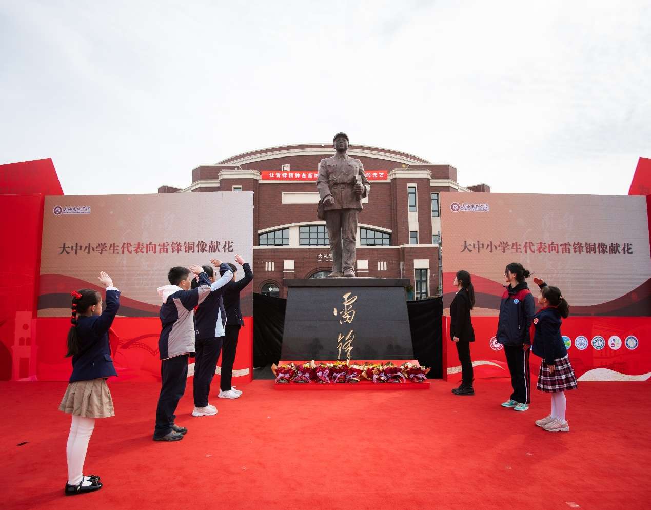 “弘扬雷锋精神、培育时代新人”——上海建桥学院举办纪念毛泽东等老一辈革命家为雷锋同志题词六十周年主题活动光明日报客户端光明日报全媒体记者 任鹏2023-03-04 11:49“每次从他身旁走过,我都会想着该怎么向他学习。作为新时代的大学生,我们要在学习中、生活中赋予实际行动,从小事做起,让雷锋精神永驻心间。”在上海建桥学院的雷锋铜像下,上海建桥学院雷锋金奖获得者国际教育学院蒋子辰同学说。3月3日,在纪念毛泽东等老一辈革命家为雷锋同志题词六十周年之际,来自上海建桥学院、上海海洋大学、上海中学东校、建平临港小学等9所大中小学的师生代表齐聚上海建桥学院,同上一堂以 “弘扬雷锋精神、培育时代新人” 为主题的大思政课,让雷锋精神绽放新时代的光芒。在这堂雷锋课上,全国劳动模范陆美红带领同学们走进“雷锋讲堂”,对雷锋生前的事迹娓娓道来;大中小学生们齐声朗诵《新时代、新雷锋》,表达着对雷锋的敬佩之情;同学们通过讲述《雷锋的故事》,领悟“雷锋出差一千里,好事做了一火车”乐于助人的精神;一首《学习雷锋好榜样》的歌曲,把会场上每个人的心紧紧连在一起……活动现场,为2022年度“弘扬雷锋精神”金奖奖章获得者进