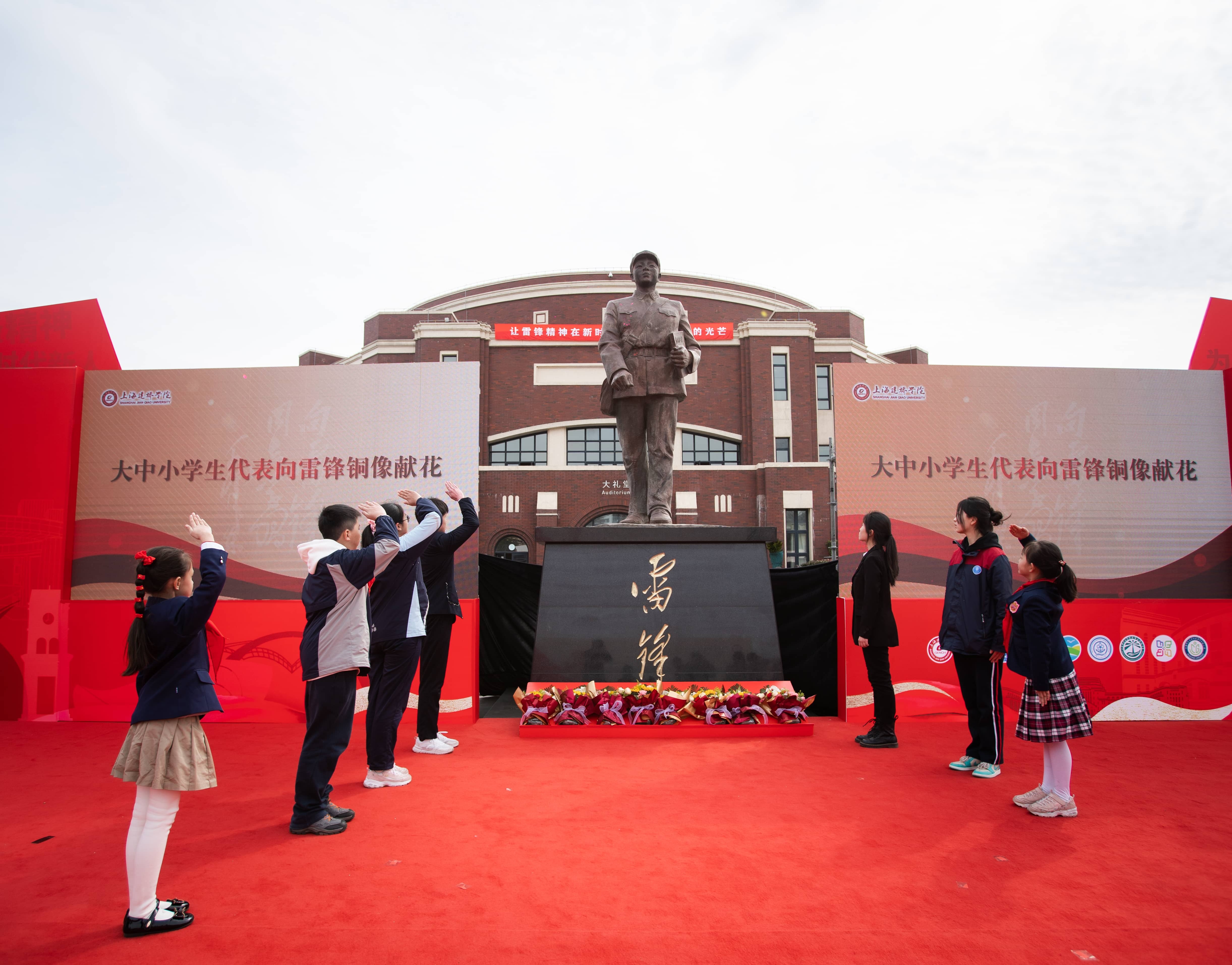 临港大中小学生在建桥学院向雷锋铜像献花 走进“雷锋讲堂”学习弘扬雷锋精神2023-03-05 10:34:02作者:刘晓晶来源:东方网选稿:施丰奕东方网记者刘晓晶报道:“雷锋叔叔,我们想成为你!”3月5日学雷锋纪念日来临之际,一首由临港新片区大中小学生代表共同献唱的“大思政合唱曲”,在上海建桥学院雷锋广场的上空飘荡,纪念毛泽东等老一辈革命家为雷锋同志题词六十周年主题活动在此举行。当天,来自上海建桥学院、上海海洋大学、上海中学东校、临港实验中学、临港第一中学、建平临港小学、明珠临港小学、上海师范大学附属浦东临港中(小)学等9校的师生代表齐聚一起,同上一堂雷锋课,通过对雷锋精神多层次解读、多样化实践,当好雷锋传人,让雷锋精神在新时代绽放更加璀璨的光芒。怎么把雷锋精神代代传承下去?在这堂以“弘扬雷锋精神、培育时代新人”为主题的大思政课上,全国劳动模范陆美红带领同学们走进“雷锋讲堂”,对雷锋生前的事迹娓娓道来,表达着对雷锋的敬佩之情;同学们通过讲述《雷锋的故事》,领悟“雷锋出差一千里,好事做了一火车”乐于助人的精神;一首《学习雷锋好榜样》的歌曲,把会场上每个人的心紧紧连在一起……活动还为上海建