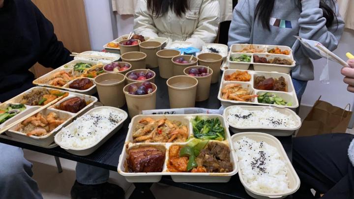 记者 |潘晨聪“虽然身在异乡,但是年味不减。”年关将至,第一次在外过年的上海建桥学院18级国商专业李昊乾同学,并不觉得孤单。他以一张特殊的“全家福”照片记录下学校里浓浓的年味。镜头里,有充当“外卖员”送餐到寝的辅导员,他们送来的餐盒中热气腾腾菜,每一道都由校领导后厨掌勺;有一起参加学校剪窗花、写春联、扮寝室活动,共同迎新年的小伙伴。寒假里与李昊乾同学一样选择就地过年的师生还有近百位。从回家团圆,众人分享“桌餐”,到减少聚集,一人食用“盒饭”,怎样才能让师生品尝到暖胃又暖心的年夜饭,感受年味?作为每年春节建桥学院的保留节目,寒假留校同学的年夜饭菜单里,校领导掌勺的家常菜历来是标配。今年,建桥校领导们们掌勺同学年夜饭餐盒中的“五菜一汤”:红烧肉、红烧牛尾、菠萝鸡块、开背虾、炒青菜、“芋”贵人羹汤。红烧牛尾,是副校长俞晓光的一道“保留菜”。为了让这道象征着“从牛头红到牛尾”的菜,酥嫩软糯,浓香入味,他下午两点就赶到后厨,花数小时慢炖。在校长朱瑞庭的家乡诸暨,一道分量十足,清香不腻的红烧肉要配上马剑馒头,充满了家乡年味。他希望这道菜在让同学们品尝手艺的同时勾起对家的回味。菠萝鸡块,是党委书记江