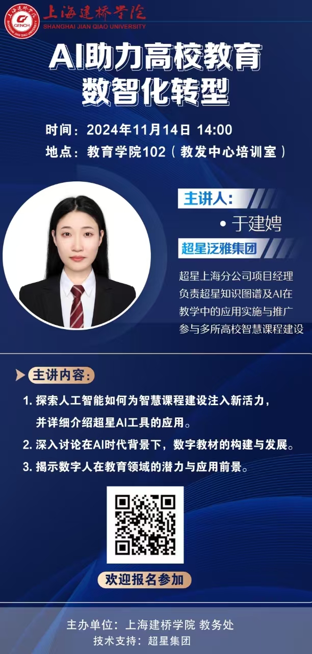 “AI助力高校教育数智化转型”沙龙研讨活动【主 题】:AI助力高校教育数智化转型【主 讲 人】:于建娉(超星泛雅集团)【参与对象】:欢迎感兴趣的老师们积极参加【活动地点】:教育学院102(教发中心培训室)【活动时间】:11月14日,14:00-15:00【活动简介】