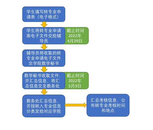 关于开展2022年本科学生转专业工作的通知根据《学生转专业实施细则SJQU-WI-JW-603 (A0)》,即日起启动2022年本科(2021级和2020级)学生转专业工作,学生可按如下流程进行操作:1.学生首先确认自身是否具备转专业基本条件。曾有违反校纪校规和《学生行为守则》的学生,第一学期必修课程成绩不合格者,定向或委托培养的学生(如中本贯通等),不能进行转专业。艺术类和非艺术类专业不可互转,已经转过专业的学生不可再次转专业。2.符合转专业条件的学生可根据个人意愿、自身条件以及“各专业接收学生转专业人数、条件、考核方式一览表”(附件1、2)内相关要求和内容,选择拟转入专业。学生在校期间只允许一次转专业,请学生慎重考虑。3.学生在4月29日之前填妥《学生转专业申请表SJQU-QR-JW-622(A2)》(下载路径:https://iso.gench.edu.cn/2018/0503/c5691a67463/page.psp),并将表格交到辅导员,由辅导员汇总完毕后交至所在学院教务秘书处。具体流程见下图。4.学生根据每个专业的考核内容和考核方式备考。5.各学院于5月3日前将收齐的表格交