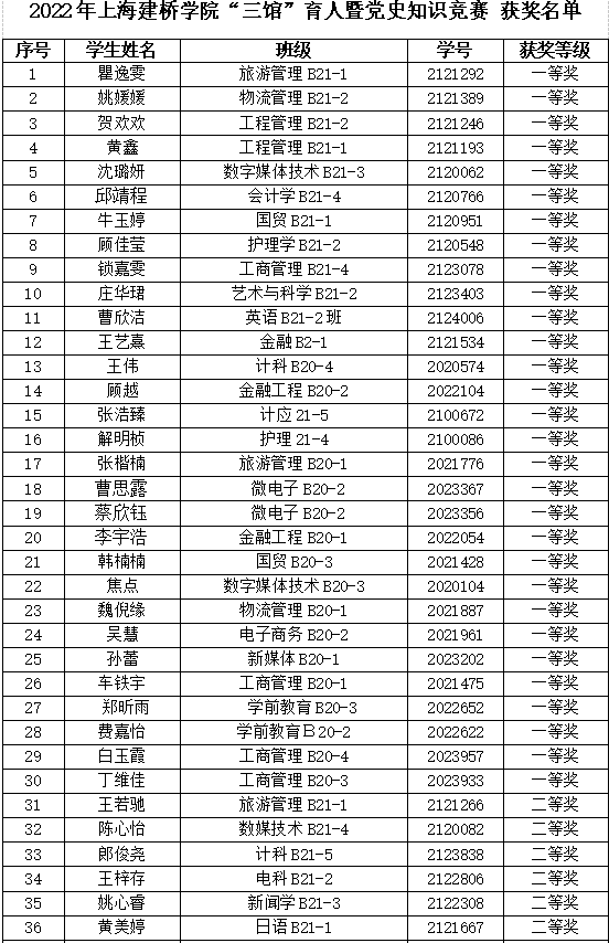 上海建桥学院“三馆”育人暨党史知识竞赛成功举办为学习贯彻习近平总书记4月在中国人民大学讲话精神,迎接党的二十大召开,上海建桥学院在“五一”假期,结合疫情防控需要,充分利用本校雷锋馆、国政馆、党建育人馆三个VR展馆资源对大学生进行育人和党史教育,以增加大学生进行思想政治教育和引领工作。本次竞赛将“三馆”育人知识与百年党史知识相结合。竞赛采用先VR线上参观“三馆”,后撰写观后感参加评选的方式进行。本次竞赛由上海建桥学院教务处、马克思主义学院、组织部、学生处、团委联合主办和组织,经过组织动员,举办方共收到参赛文章3000多篇,经初选共有400多篇进入决赛,经过马院组织教师进行评定,最终190名同学分获一二三等奖。通过本次竞赛,丰富了同学们“五一”假期的生活,同时也增强大学生对学校“三馆”内容、党史知识和伟大建党精神的学习和理解,做到知史爱党、知史爱国,进一步增强走中国特色社会主义道路、为实现中华民族伟大复兴不懈奋斗的自觉性和坚定性。商学院工程管理B21-2班贺欢欢同学表示,通过本次VR形式参观“三馆”,深深感到在未来的学习生活中自己应吃苦在前,享受在后,克己奉公,多作贡献。坚决维护人民群众的