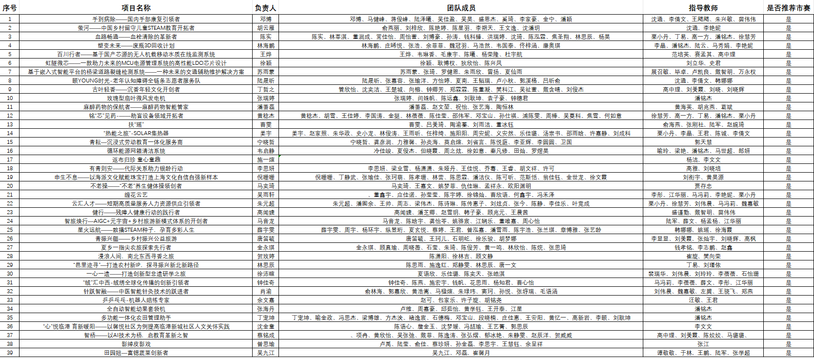 各二级学院、各项目组:第十四届“挑战杯”上海市大学生创业计划竞赛上海建桥学院校赛共收到816个项目。根据相关文件要求,经各项目组自主申报,专家评审,学院推荐,现拟推选校级优秀项目共39个项目报送参加上海市赛,现予以公示,公示期为5月31日——6月4日(共5天)。如对公示内容有异议,请在公示期内以书面形式向学校团委反映。反映情况时要签署真实姓名,要有具体事实;不签署真实姓名或不提供具体事实材料的,一律不予受理。联系人:田凯丰联系方式:58137895地址:学生事务中心223 共青团上海建桥学院委员会 2024年5月30日附件: 共青团上海建桥学院委员会 2024年5月30日