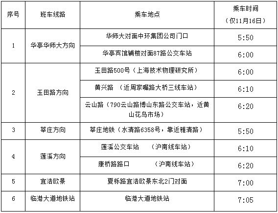 各位教职员工:根据工作安排,11月16日7:30在学校大礼堂举行浦东新区人大换届选举投票大会,为保证选举工作的正常开展,经研究决定,对11月16日学校班车运行时间做如下调整:序号班车线路乘车地点乘车时间(仅11月16日)1华亭华师大方向华师大对面中环集团公司门口5:50华亭宾馆辅楼对面87路公交车站6:002玉田路方向玉田路500号(上海技术物理研究所)6:00黄兴路 (近周家嘴路大桥三线车站)6:10云山路(790云山路博山东路公交车站,近黄山花鸟市场)6:203莘庄方向莘庄地铁(水清路6358号,靠近雅清路)5:504莲溪方向莲溪公交车站 (沪南线车站)6:10康桥路路口 (沪南线车站)6:205宜浩欧景夏栎路宜浩欧景东北2门对面7:006临港大道地铁站临港大道地铁站7:05请各位教工提前做好乘坐准备,给您带来的不便,敬请谅解。后勤保卫处2021年11月12日