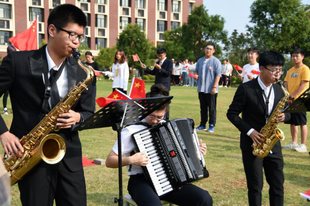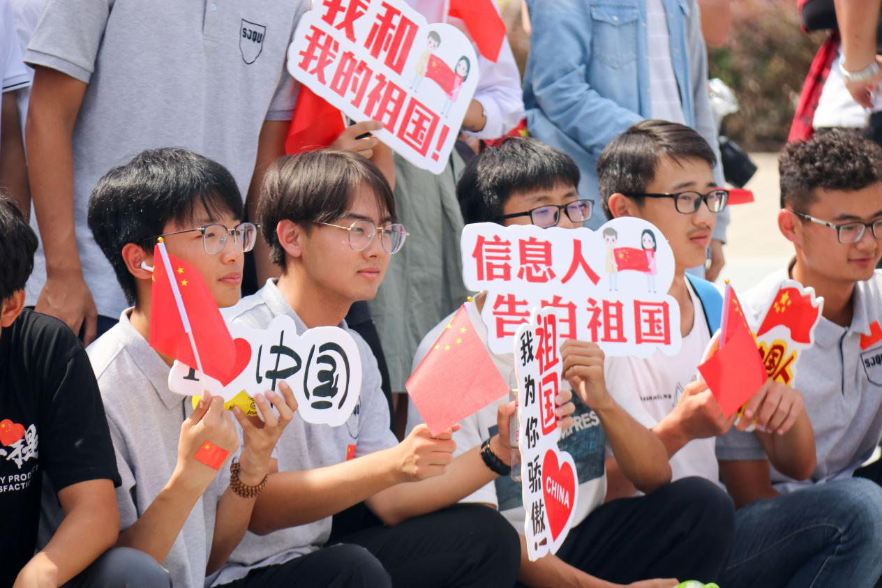 下午14点,在校图书馆前的广场上,数千名学生通过乐器表演、诗歌朗诵、红歌合唱等形式,表达了拳拳爱国心,合唱一首《我和我的祖国》把活动推向了高潮,现场气氛十分热烈,激发了信息学子们发自内心的爱国之情。