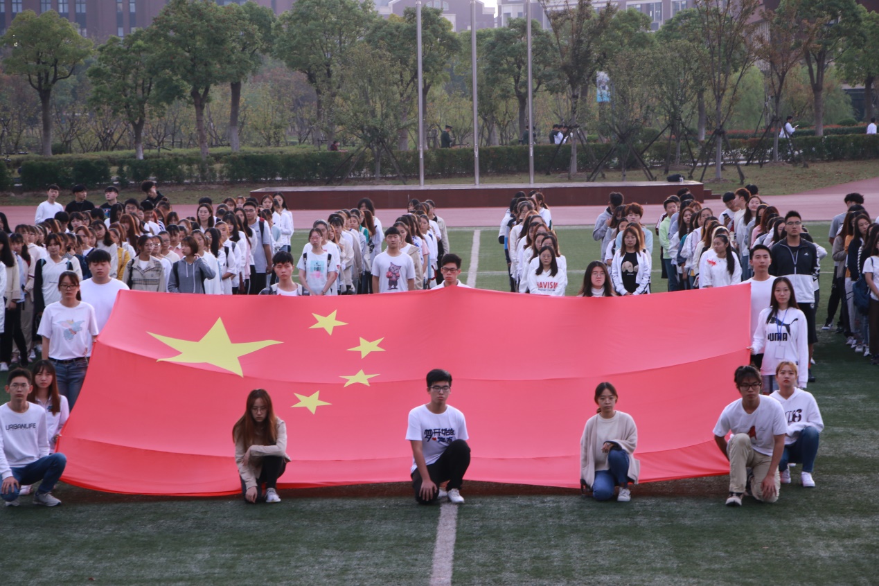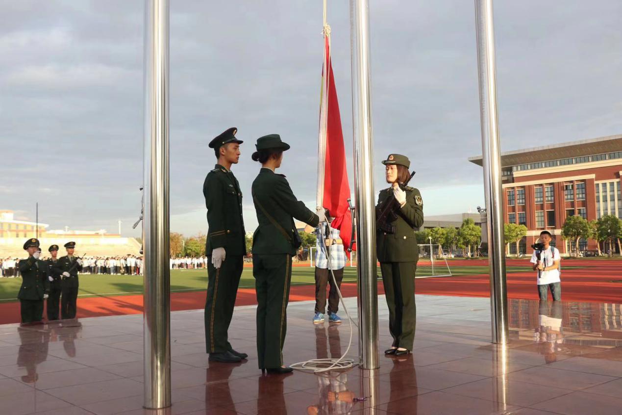 早上六点,天微亮。19级新生每人手持一面小国旗,在操场上按队列排出“不忘初心、牢记使命”八个大字。《义勇军进行曲》响起,护旗手护送着五星红旗入场,全体师生对冉冉升起的五星红旗行注目礼。