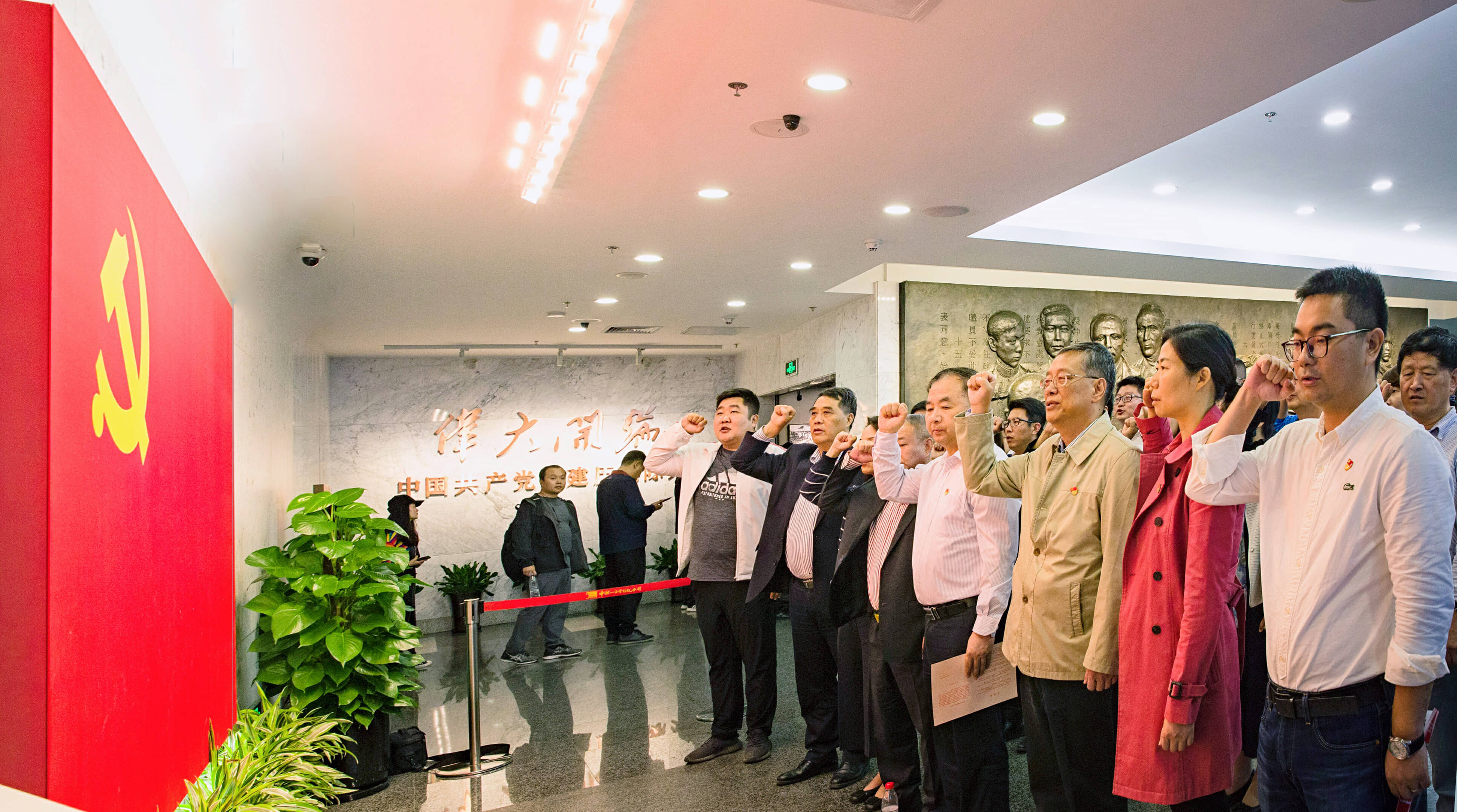 纪念馆一楼的序厅里,各位新老党员佩戴党徽,江彦桥带领全体同志在鲜红的党旗前高举右拳,重温入党誓词。