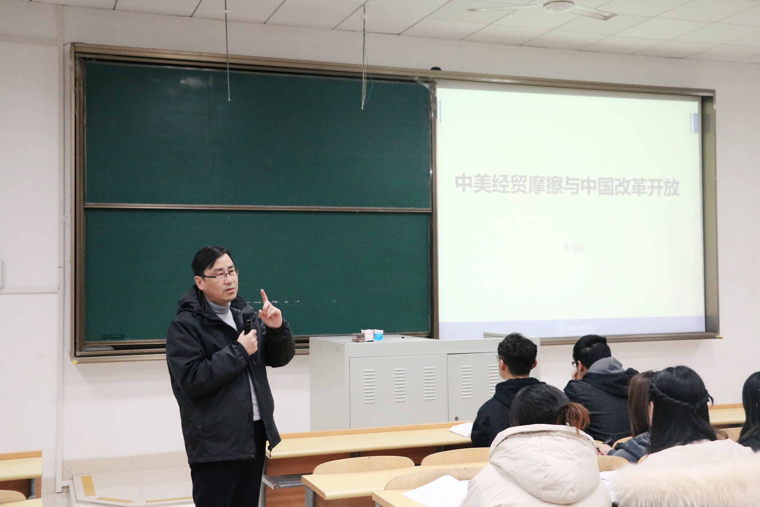 12月4日,朱瑞庭校长为商学院为商学院19级工商管理专业学生作主题为“中美贸易摩擦与中国改革开放”的专题讲座。商学院党总支书记刘爱香及200余名同学现场聆听了讲座。