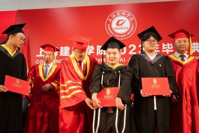 陈光耀(中)领取毕业证书 采访对象 供图在上海建桥学院2023年毕业典礼上,坐在轮椅上的毕业生陈光耀显得很...