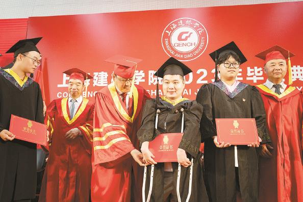 ■本报记者 储舒婷 在上海建桥学院日前举行的2023年毕业典礼上,6000多名学生中,有一位坐着轮椅的毕业生很...