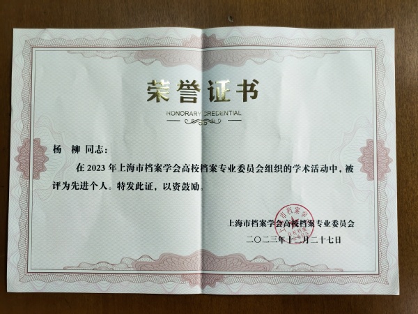 杨柳老师获2023年上海市档案学会高校档案专业委员会学术活动先进个人