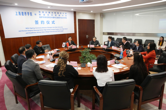 11月19日,韩国艺术高级中学校长、韩国大田大松高级中学、哈萨克斯坦阿拉木图州立服务与技术学院校长团访问我校。校长朱瑞庭在S417会见来宾。国际设计学院院长金亨锡,教务处处长徐方勤,学校办公室副主任徐皓刚,对外交流办公室副主任梁月泉陪同接待。