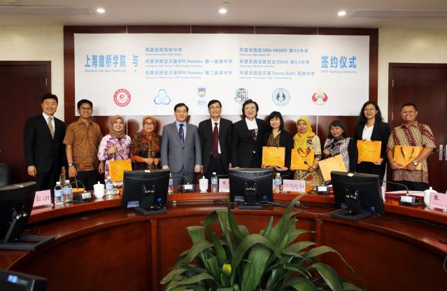 4月23日,韩国、印度尼西亚六校高中校长及负责人来访我校。校长朱瑞庭在S410接待来宾。