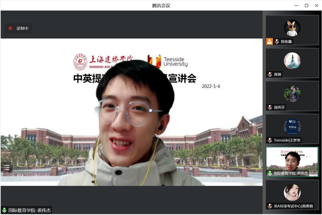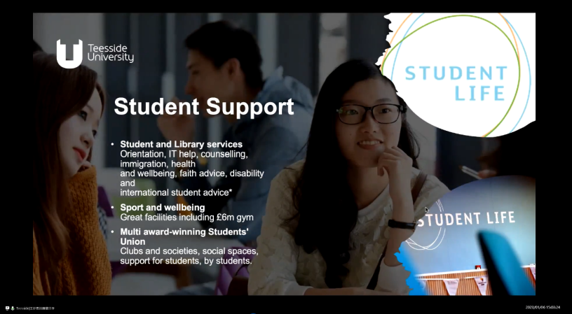 宣讲会特别安排了我校首批赴英的2019级数字媒体技术专业裘伟杰,张悦曈,夏宇星3位同学实时连线分享在英几个月的读书和生活。他们从提赛德大学的学习环境、软硬件设施、交流沟通的语言环境、周边生活等等方面做了生动细致贴心的交流,并热情鼓励学弟学妹们做好全方面准备顺利开启赴英学习之旅。在互动环节,同学们就留学中的热点问题和家长们关心的问题踊跃提问。