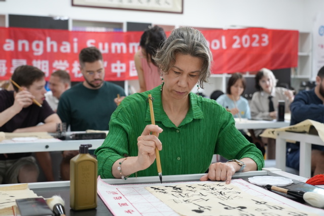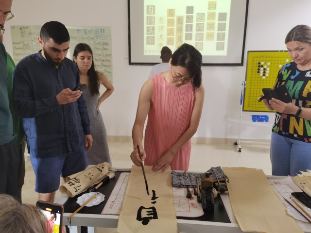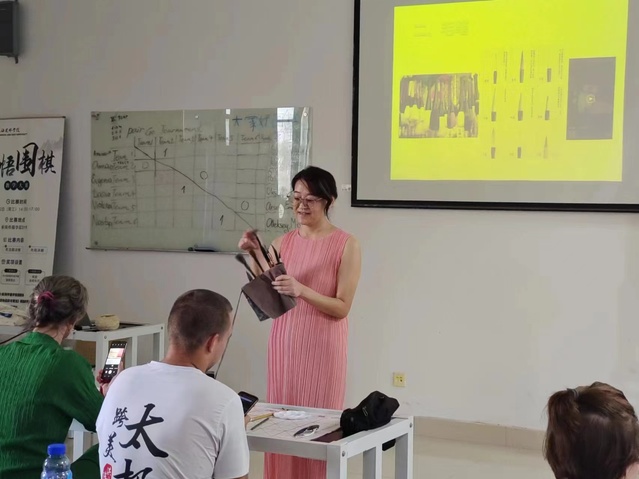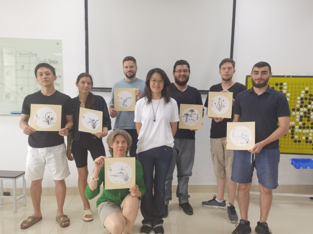 中国艺术研究院艺术学博士鹿芸薇老师向国际学员们介绍了汉字的演变过程,关于文房四宝“笔、墨、纸、砚”、笔法比喻和笔画拟像等进行逐一讲解,同时还展示了楷书、草书、行书等不同字体的书法作品和优秀的中国画作品,使其对中国书画有了初步的认知。练习环节,鹿老师耐心指导国际学员们握笔方式,细心讲解书写技巧和绘画技法,学员们对照样品临摹,逐渐掌握要领,书画作品不断获得老师的好评。