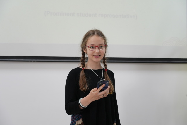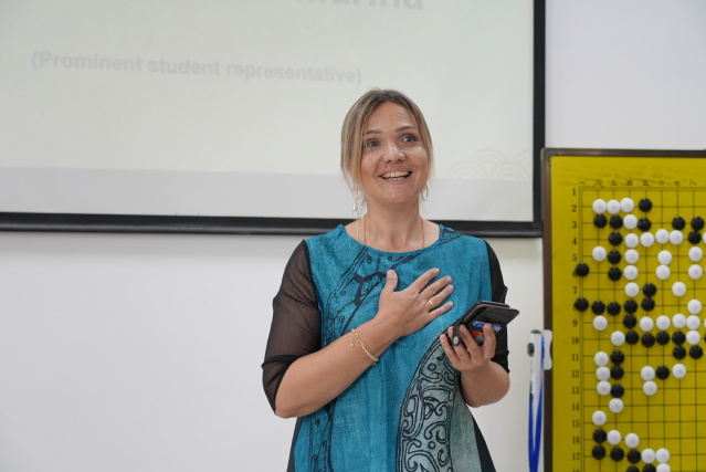 优秀学员玛丽娜(Syroezhkina Marina)代表莫斯科围棋协会发言。她感谢建桥团队提供了宝贵的学习机会和悉心周到的服务,向全体学员提供了通过学习围棋来接触中国文化的机会。她坚信,学员们通过这个项目获得经验和深入交流,象征着中国与世界各国友谊的升华。Marina女士衷心感谢我校付出的努力,希望学员们将此次所得所学运用到其文化价值观建设中,不断增强学习动力,卓越成长。
