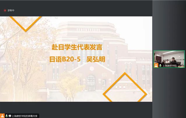 2020级日语专业吴弘明作为赴日学生代表发言,分享了在校期间的感受、赴日留学的计划,并向建桥表达对母校的感恩之情。他代表所有赴日学生做出承诺,将在建桥培养的基础上迈向更高阶段的征途,珍惜学习机会不断进取,力争成为担负起国家社会繁荣发展的新时代青年。
