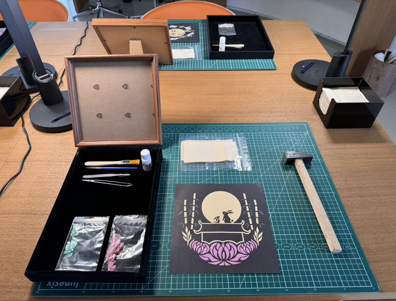紧接着,进入手作环节,师生可自选三个中秋主题:“群兔拜月”以玉兔祈愿传说为灵感,用白螺片表现兔毛、金箔点染月光,呼应团圆祝福;“檐上观月”刻画兔子坐屋檐望月之景,以屋檐喻家,配莲花纹样添东方韵味;“跃兔祥云” 展现兔跃祥云的动感,圆形外框象征圆满。师生专注创作,每一份手作里的螺钿都映出彩虹光泽,金箔如月光闪耀,尽显巧妙构思。活动尾声,师生们同举作品预祝彼此“中秋快乐”,来自俄罗斯的国际学生们表示不仅收获了专属艺术品,更触摸到中华文化的温度。