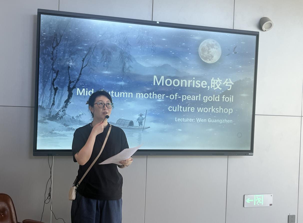 随后珠宝学院产品设计(珠宝首饰设计)副系主任温广珍老师为大家深入解读中秋节内涵。“中秋”是全球16亿华人的“情感锚点”,圆月承载着对家和亲人的思念,也是外国朋友理解中国家庭、团圆与自然敬畏文化的窗口。她还梳理了中秋三千年演变:从周代帝王祭月感恩,到唐代文人赏月赋诗,宋代后,“团圆”成为节日的核心,赏月、吃月饼及用柚子(谐音“佑子”)、桂花酒等物品祭月的习俗延续至今。温老师重点诠释了月亮与玉兔意象:在中国文化中,月亮是情感载体。月宫中嫦娥、玉兔等神话赋予其浪漫色彩,温顺的玉兔是核心主角,呼应中秋团圆氛围。