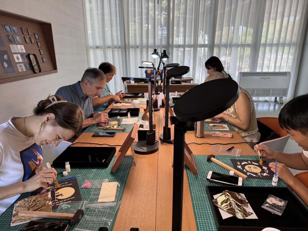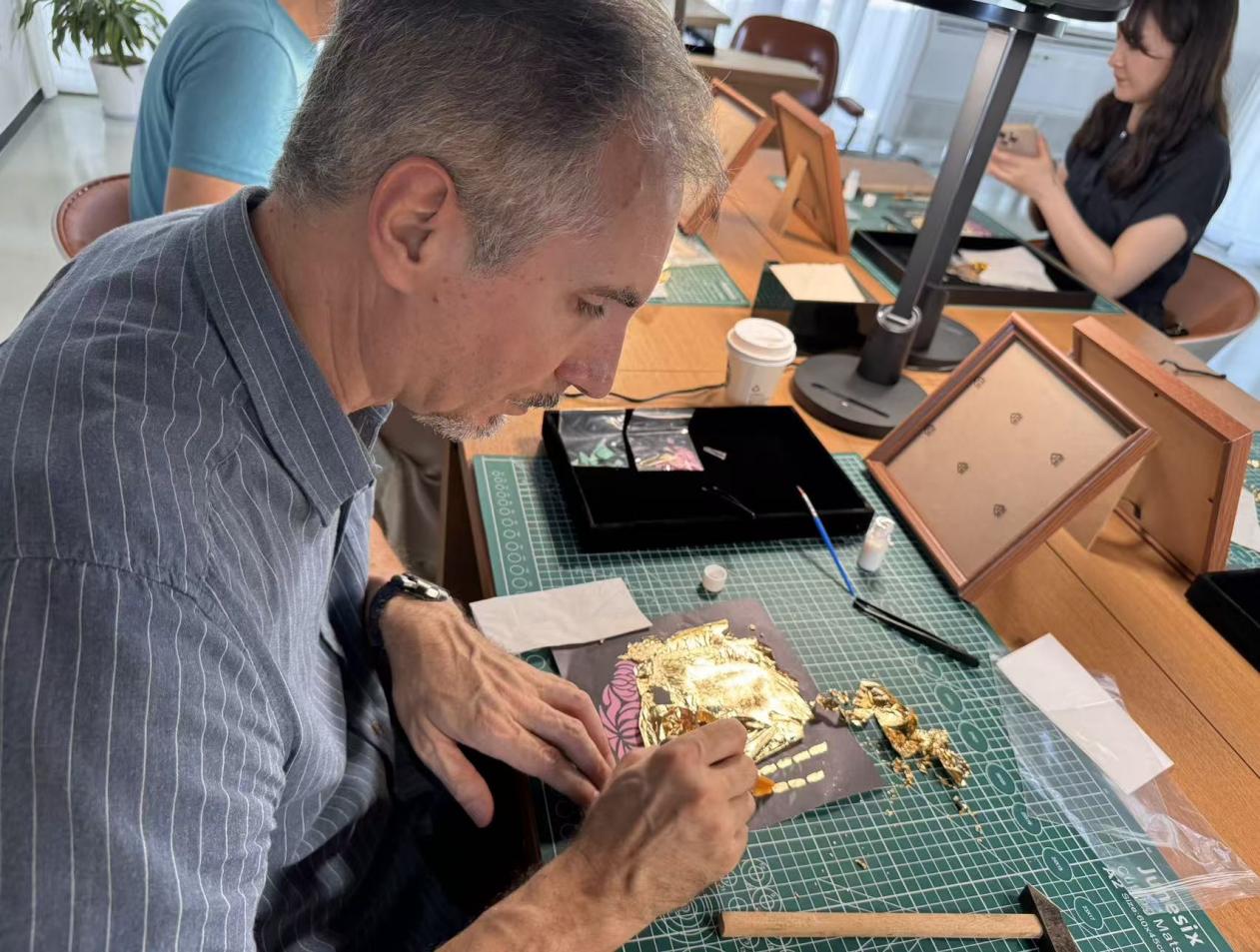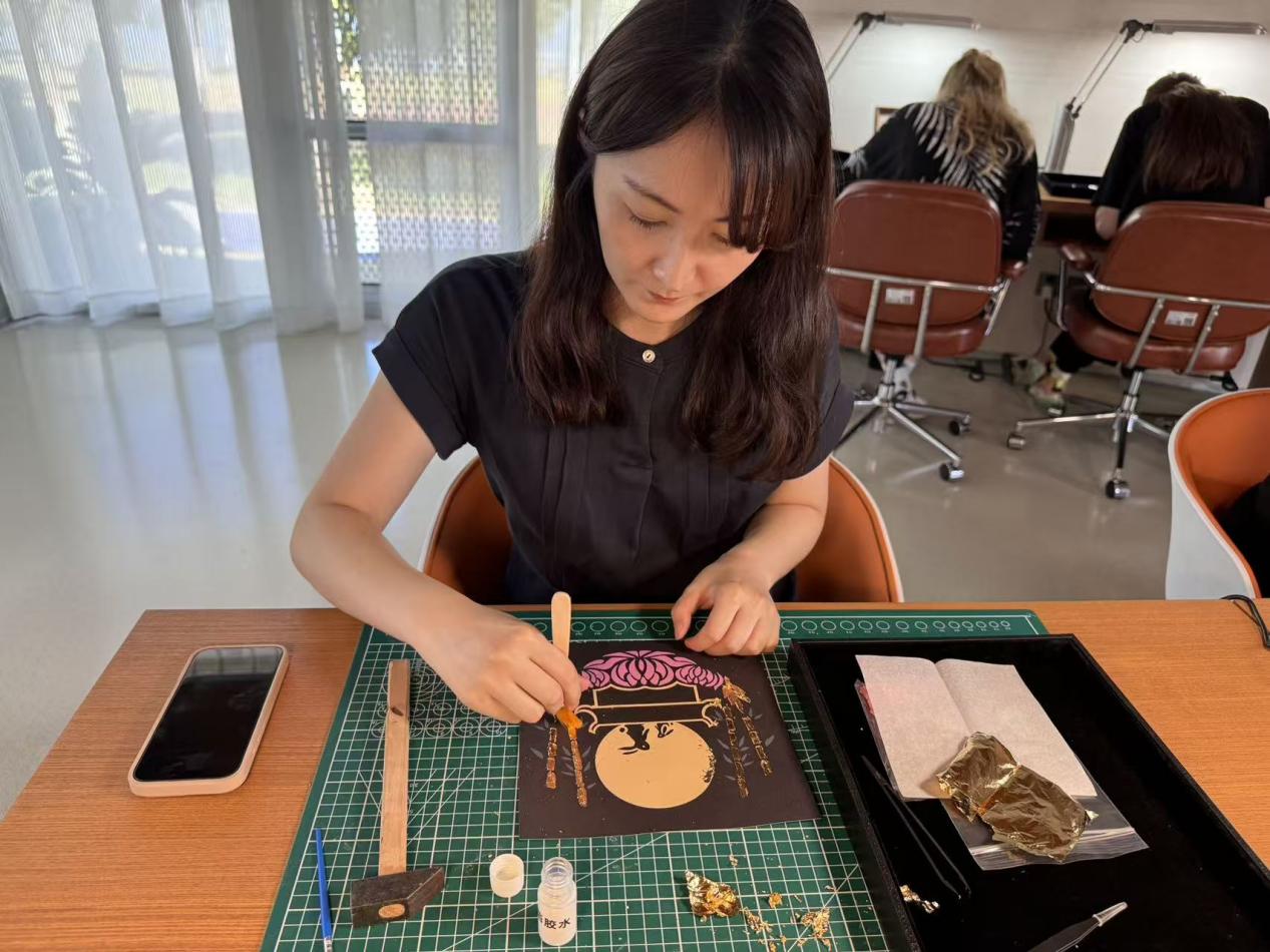 最后介绍本次手作的螺钿与金箔两大“材料主角”:螺钿是经精细处理的贝壳,有“大海的千年彩虹”之称,商代已出现,唐代“螺钿紫檀五弦琵琶”为传世国宝,制作工序繁杂,承载自然之美与匠人智慧;金箔被誉为“被锤扁的阳光”,古时为皇家与佛教造像专用,故宫金銮殿多用之象征神圣光明,需经几十万次捶打至0.1微米厚,考验匠人技艺。二者共同诠释了中国传统工艺对自然与美的追求。