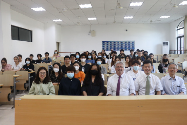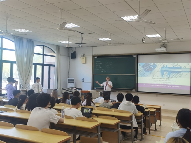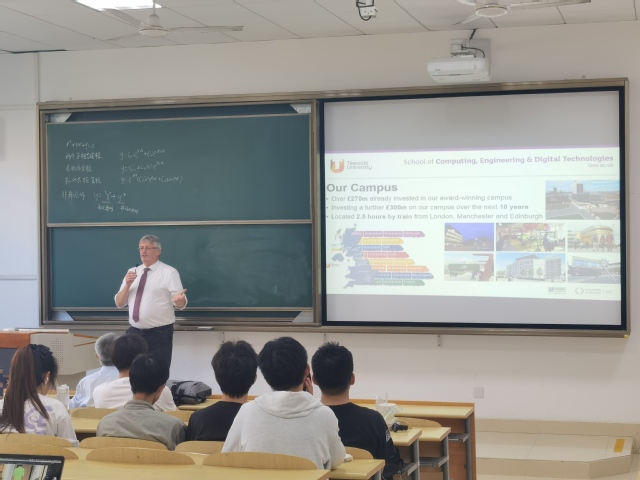 随后,在二教104召开了英国提赛德大学计算机工程与数字科技学院教授见面会。Gordon Marshall副院长与专业大一、大二年级60余名学生见面交流。Gordon Marshall副院长关于英国提赛德大学的校园环境、院部设置、专业课程等作了介绍说明。学生在互动交流环节就赴英学习、专业信息等积极提问,现场气氛十分活跃。