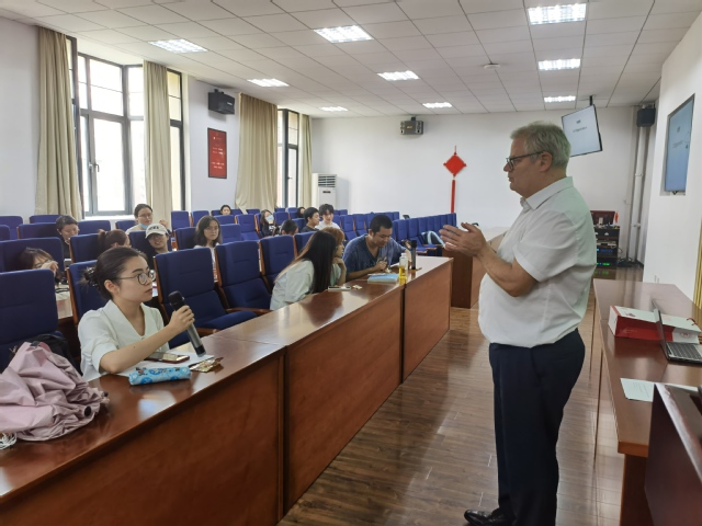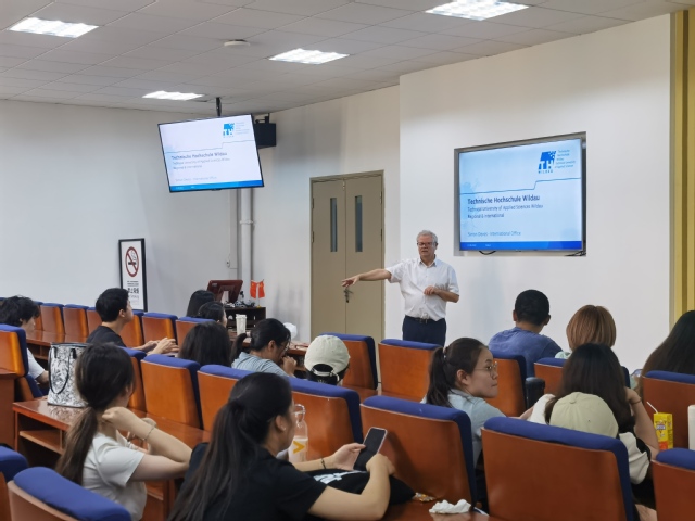 当日下午,在商学院323会议室召开了德国维尔道应用技术大学教授见面会,Stefan Strassner教授与国际经济与贸易、工商管理、英语、德语专业近50名学生现场交流。他介绍了德国维尔道应用技术大学的学校位置、校园环境与服务、专业课程、实验室与研究等总体情况,互动交流环节气氛热烈,参会学生积极提问发言,对于同学们关心的出国申请、跨专业申请、德语学习、在德住宿等问题Stefan Strassner教授逐一做出了详细解答。
