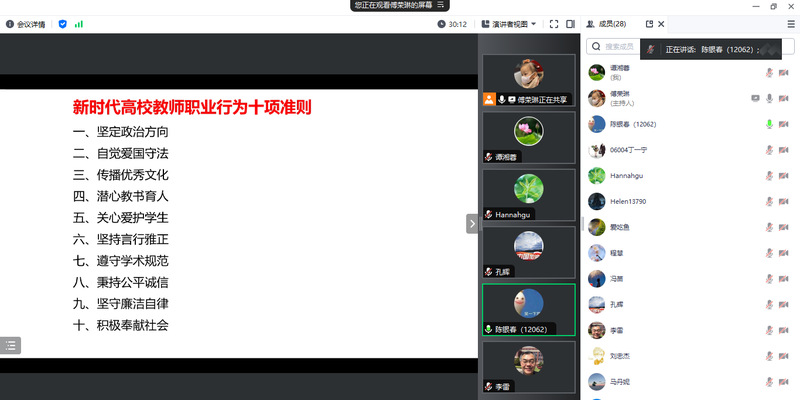 会上,大英部党支部书记陈银春老师带领大家学习,要求大家坚定政治方向,按照《教师法》的要求对待教学和科研工作;陈老师重申了新时代高校教师职业行为十项准则,要求老师们谨言慎行,为学生树立正确的榜样。