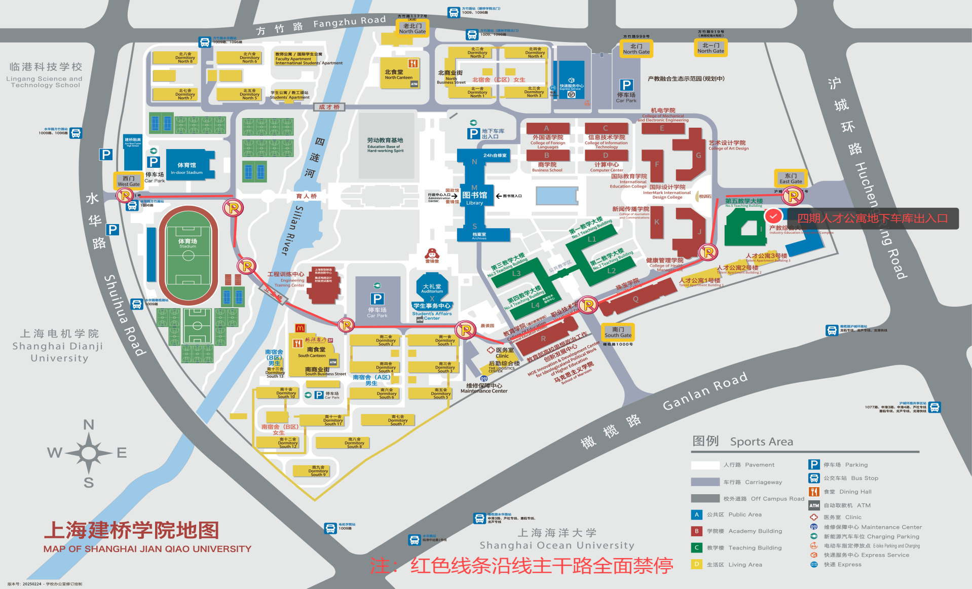 尊敬的教职员工:为进一步优化校园交通秩序,保障师生出行安全与便捷,营造良好的校园环境,根据校园整体规划及交通管理需求,经研究决定,自2025年4月10日起,对校园南区主干道实施车辆禁停管理,并开放东门通行。现将有关事项通知如下:1.学校南区主干道(范围为西门进入校园南区域至东门T字路口全线)全面禁止停车。2.南区上班的教职员工可将车辆停放于四期人才公寓地下车库(沪城环路车库出口暂不开放)、学生事务中心停车场以及校内其他划线指定停车区域,并保持车辆有序、按规停放。3.每日7:00至19:00期间,开放东门供教职员工机动车辆通行。请各位教职员工配合校园交通管理,校内减速慢行。特此通知,感谢配合。后勤保卫处2025年4月8日附件1:校园南区禁停示意图附件2:四期人才公寓地下车库平面图