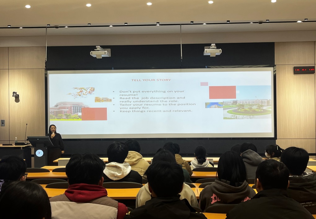 2023年11月30日,对外交流办公室、国际教育学院和科研处联合举办百家讲坛《大学生求职胜任力培养》讲座。主讲嘉宾郭昊老师现为上海纽约大学职业发展中心负责人,在高等教育行业及中外合作办学领域有丰富的工作经验。郭昊老师长期为上海纽约大学职业发展中心提供战略指导和管理,致力于领导团队对不同学生群体的独特职业兴趣展开特色项目及咨询,并善于将其与各行业机会联系起来,以帮助他们探索自我,发掘职业兴趣以达到职业发展和职业满意,她还与纽约大学校园和纽约大学阿布扎比职业发展中心紧密合作。郭昊老师于2021年6月成为我校全球素养实验班的特聘教授,授课课程为《跨国公司求职》。本次讲座上,郭昊老师首先对当前就业市场进行了分析,她指出用人单位越来越注重应聘者的综合能力。因此,大学生需要在提升专业知识的同时,加强对求职胜任力的锻炼。其次,郭老师以如何写好一份英文简历为切入点,详细地为在座的同学们解释了简历的七要素:个人信息、求职目标、教育背景、获奖情况、校内经历、实习及实践经历和相关技能证书。在撰写校内经历、实习及实践经历时,她指导学生们要注意用凝练、有力的词汇来描述,而且要将求职岗位同个人经历紧密结合起来。在