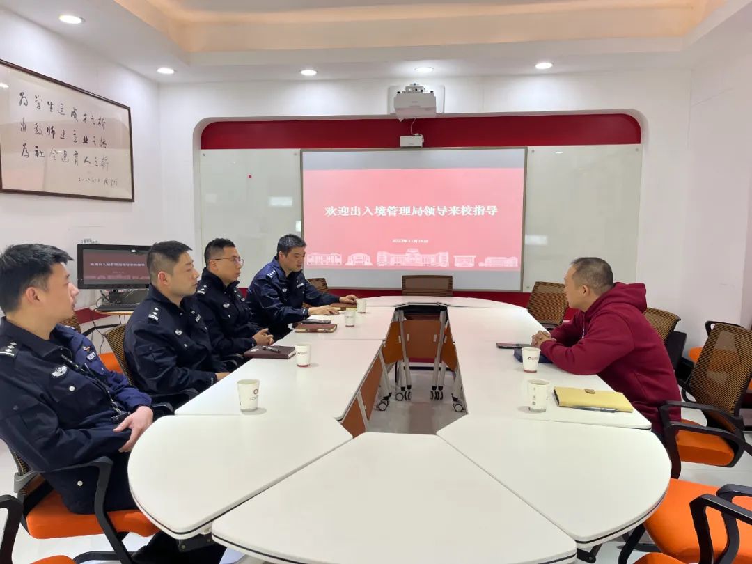 11月16日,浦东公安分局出入境管理局办公室副主任陈立俊一行来我校访问。我校对外交流办公室兼国际教育学院梁月泉院长、对外交流办公室陈栋鑫副主任陪同接待。 会上,陈栋鑫副主任介绍了我校的外籍教师和国际学生数量、在校生的生活情况以及学校在未来国际教育上的展望,特别就国际友人短期来华生活办证的重点难点向警官们详细请教。陈立俊副主任表示出入境管理局也十分关心国际友人在华的生活,为解决来华友人办证和支付难等针对性问题,陈主任为与会人员介绍了便利政策。 随后,陈栋鑫副主任陪同出入境的警官们一同走访我校国际设计学院和国际教育学院,与学院师生就在校学习生活进行互动交流。