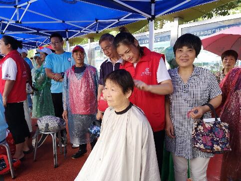 这次公益服务活动见证了建桥人践行集团“感恩、回报、爱心、责任”的执着与热情。原定9:30分开始的服务,而服务队7:45分就开始设摊服务了。这支服务队至少每月一次为社会服务,项目包含了理发、眼镜维修、家电维修、电脑维修、手机贴膜、考试咨询、缝纫、医疗咨询、驾校考证咨询……;服务队的口碑很好,当地居民早就翘首期盼了,当服务队的摊位刚铺好,附近居民就陆陆续续地到来了,一会儿便排起了长长的队伍;在这天参加志愿服务的几支队伍中,建桥志愿者服务队的摊位几乎占了一大半,是志愿者最多、服务项目最全、摊位前最热闹、服务内容最受欢迎的。大雨中,身着红色马甲的教职工和蓝色T恤衫的学生们不停地忙碌着,被周围的居民热烈地“包围”着,形成了一道为民服务的靓丽风景线。