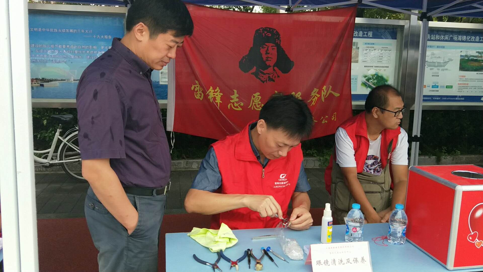 值得一提的是理发和眼睛维修的志愿者放弃了假日店内生意最好的时间,自愿来到社区当志愿者。他们说被建桥提倡的雷锋精神感染了,看着建桥人自愿放弃休息来帮助别人,很是感动,所以也跟着一起来这里为大家服务!他们摊位前排的队伍最长,中午收摊的时间已过,但还是收不了摊。理发的汤四侠师傅因不停地拿剪子,手都红肿了,还是不停地理着发,真让人感动;排在缝纫长队里的除了附近居民外,还有不少外来此地打工的民工,他们太需要有人帮着修修补补了!