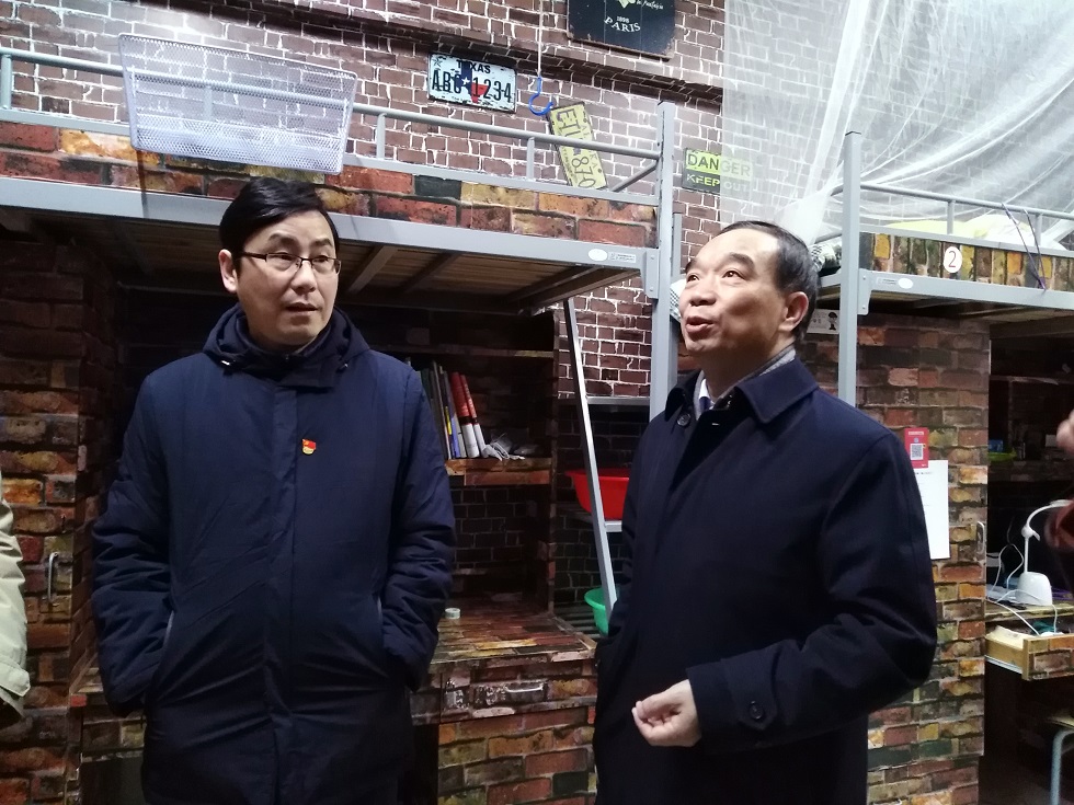在学生社区,同学们已陆续返校,社区内已经做好保洁及安全检查工作,迎接同学们的到来,同时园区值班室仍继续做好宿舍区人员进出登记,确保学生社区人员管理及出入安全。在走访学生宿舍时,一间同学们精心布置的寝室,吸引了大家的目光,朱校长、郑校长非常肯定同学们的动手能力和热爱生活,热爱自己学习生活环境的态度,鼓励同学们勤动手维护美化生活环境,但同时也要从园区的整体出发,为日后将在这间宿舍住宿的同学和打扫宿舍的保洁人员考虑,建议今后同学们有布置寝室的意愿,可向后保处学生社区服务中心提出申请,使用安全环保、易拆除和清理的材料布置寝室。