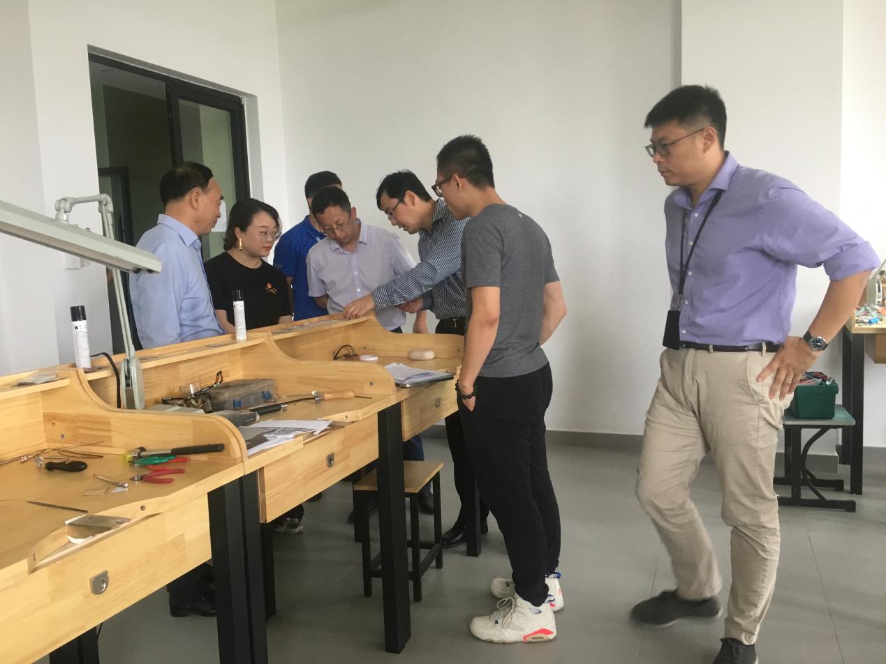 朱校长一行首先来到刚刚落成投入使用的珠宝学院大楼,仔细检查了楼面及每个教室,并认真听取了学院负责人对教室改造、展厅装饰等方面的工作汇报。