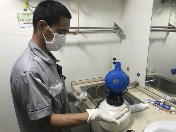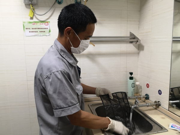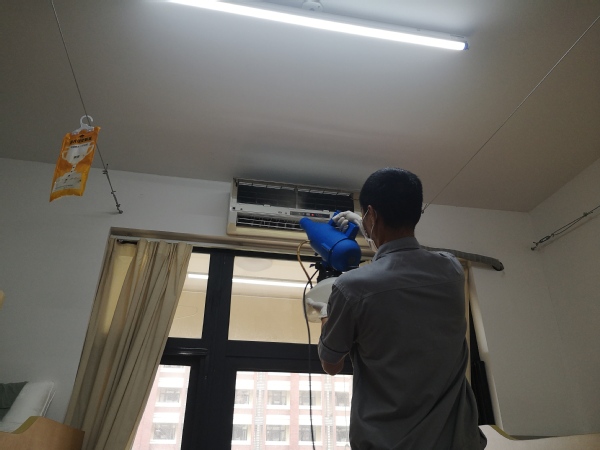 “帮我递一下抹布”、“给,已经喷过消毒剂了”、“这间搞定,下一间走起!”……让寂静了几个月的学生宿舍有了“人气”。维修师傅们扛着梯子,拿着自备的抹布和刷子等清洗工具,提着消毒液,逐层逐台清洗宿舍及公共区域的空调过滤网、翅片,擦拭进出风口,使用消毒剂循环消毒,确保空调通风顺畅。