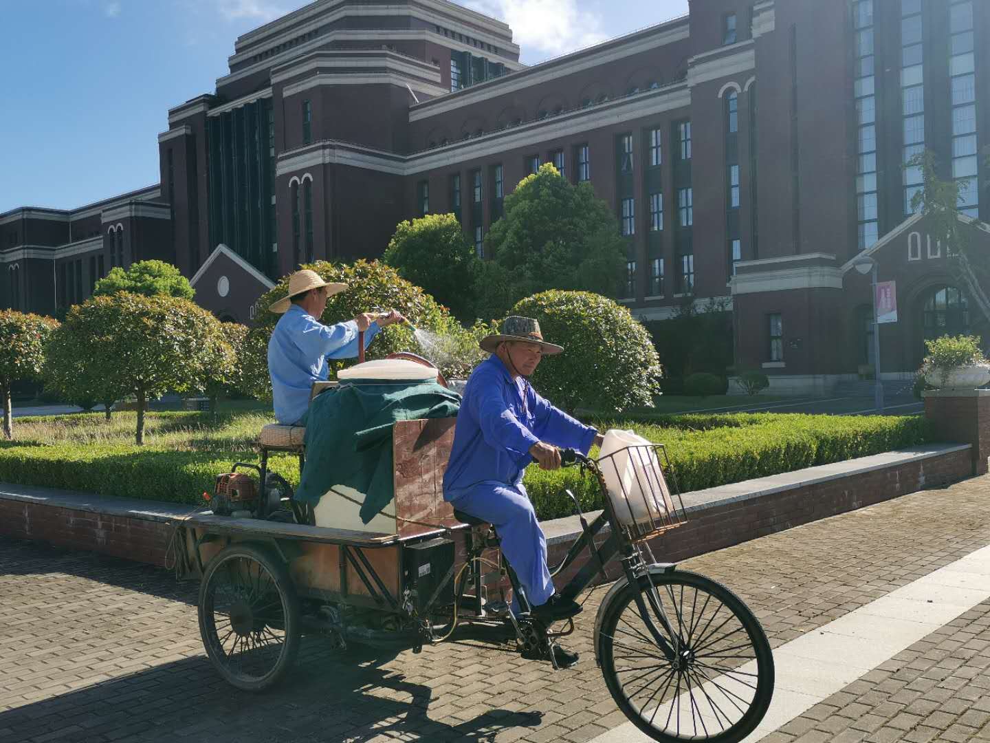 绿化服务中心暑期重点对校园内的绿植进行了修剪、移植及养护等工作。除每天为植物浇水外,还要为生有病虫害的绿植打药灭虫。虽然气味难闻,但绿化服务中心的工作人员却毫无怨言。