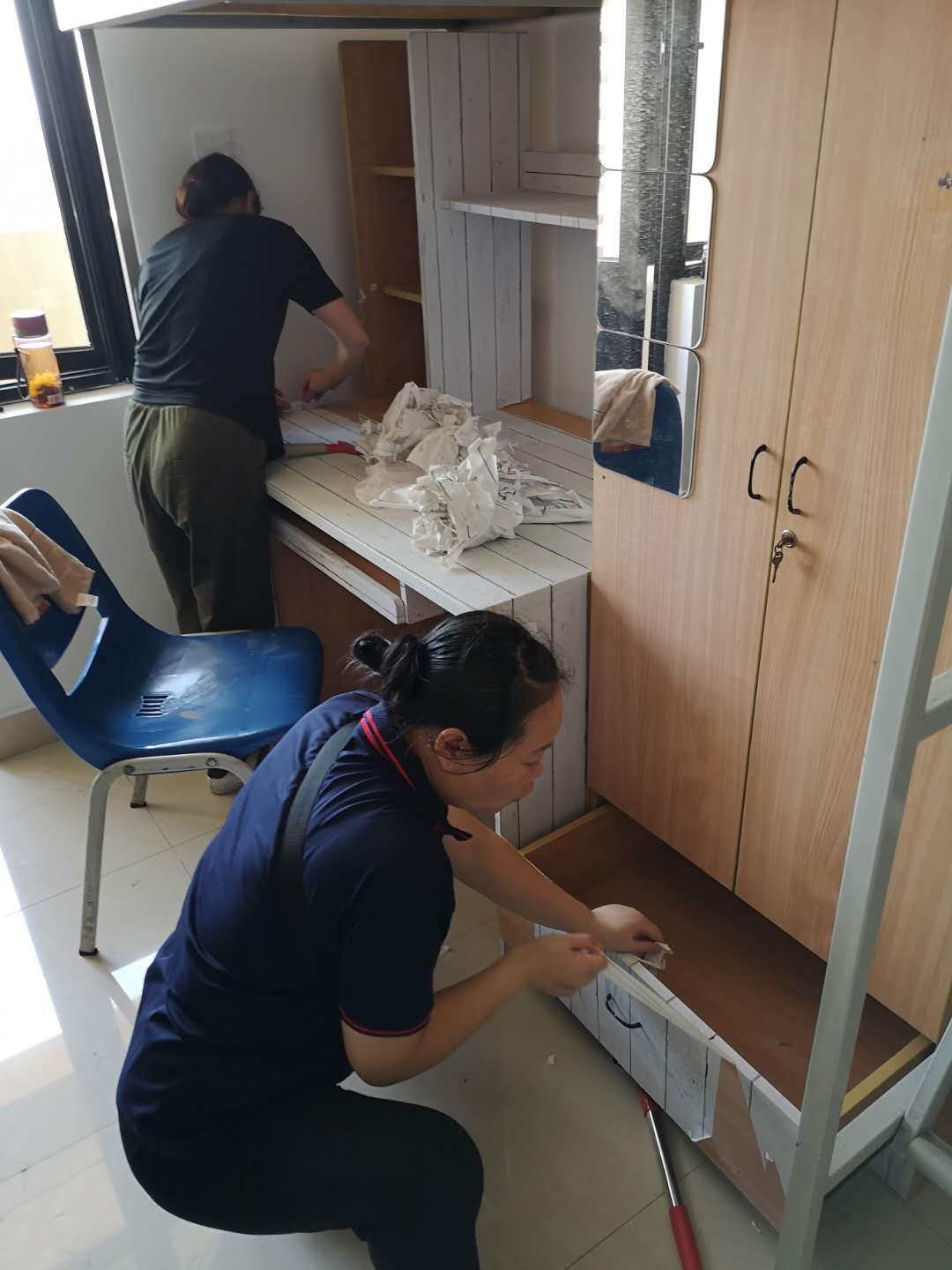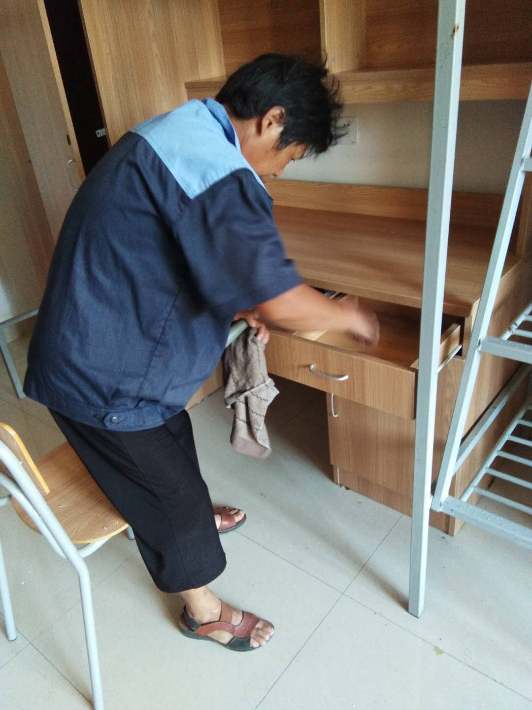物业服务中心宿管、保洁阿姨加强暑期公寓楼值班人员配置,积极做好巡查、保洁、维修工作。同时,宿管阿姨一丝不苟做好每一间新生宿舍的卫生清洁、通风及晾晒被子等工作。