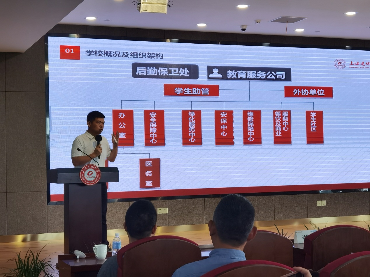 党委书记江彦桥代表学校致欢迎辞。对市教委后保处领导及各位兄弟院校同仁莅临我校表示欢迎,对大家长期给予我校后勤保卫工作的关心与支持表示衷心的感谢。江书记简要介绍了我校后勤保卫工作的基本情况,他指出我校的后勤保卫工作围绕“绿色校园”“平安校园”“智慧校园”“活力校园”的目标,深入贯彻习近平总书记安全生产重要思想,执行“以人为本、安全第一、预防为主、综合治理”的工作方针,坚持“党政同责、一岗双责、齐抓共管、失职追责”和“谁使用、谁负责,谁主管、谁负责”的原则,通过“人防、物防、技防”三防相结合形成全方位的安全态势。希望借助此次交流平台,从兄弟院校身上汲取更多的后勤服务与保卫管理的先进经验,助推建桥学院后勤保卫工作再上一个新台阶。