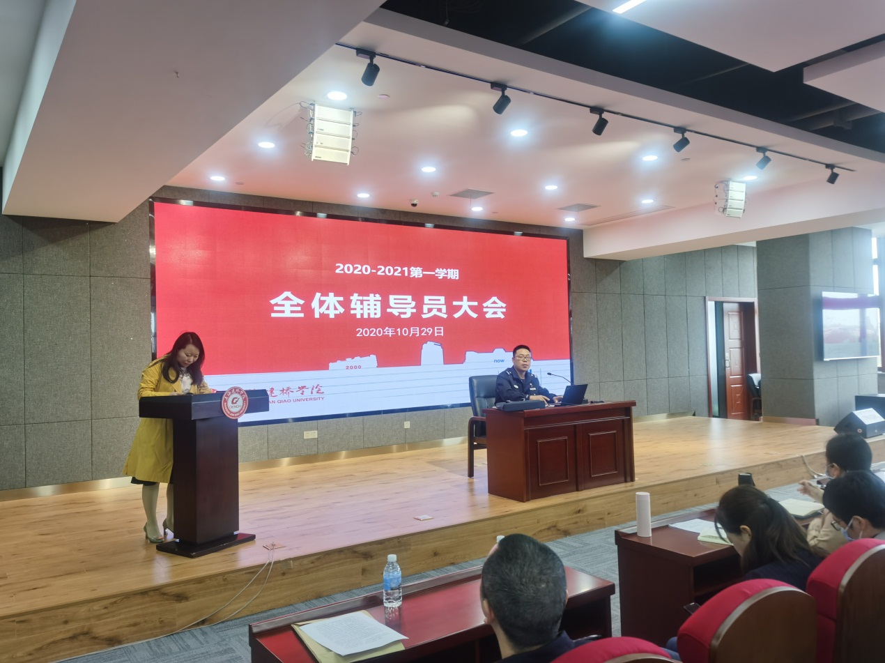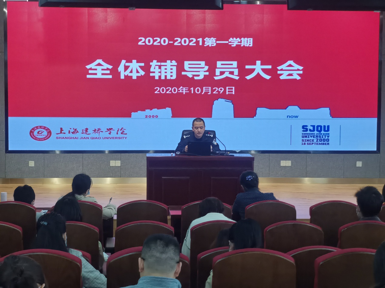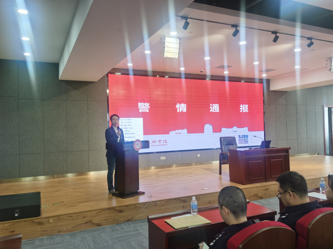 10月29日,临港新城派出所及临港高校派出所警官在珠宝学院四楼会议室召开警情通报会。上海建桥学院副校长陈伟、后勤保卫处处长杨真真、后勤保卫处副处长傅佳喆及各二级学院辅导员等出席会议。会议由后保处处长杨真真主持。