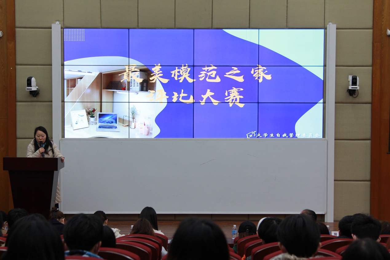 寝室是同学们学习、生活的重要场所,也是漂泊在外异地游子避风的港湾,更是展示学生们良好精神风貌的重要窗口。为进一步推进学生社区“三级建家”建设,促进学生良好习惯的养成,共同营造健康、活泼、文明的学生社区育人环境。12月3日,后勤保卫处学生社区服务中心在三教222举办2020年第一届最美“模范之家”评比大赛。旨在通过对“模范之家”寝室的评比活动树立模范寝室在全校学生中良好的示范作用,带动学生们积极学习身边典型,感受榜样力量,营造创优争先的优良学风,促进校园精神文明建设。后勤保卫处处长杨真真、各学院社区辅导员、后勤相关管理人员及园区宿舍主管出席了本次活动。