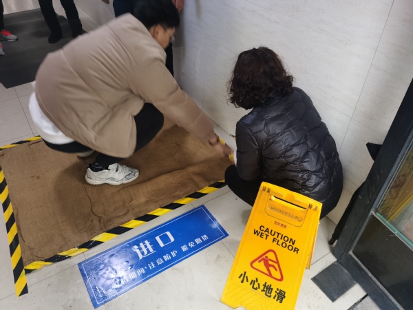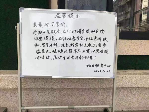 物业服务中心在各个公共楼宇张贴降温防寒提示并组织阿姨对各个寝室进行防寒工作检查,确保每一位在校师生都能提前知晓并做好防寒准备。此外,还在宿舍楼、教学楼、食堂、图书馆等公共区域人员进出口铺设麻袋等防滑垫并在醒目位置设立“小心地滑”的贴心提示。