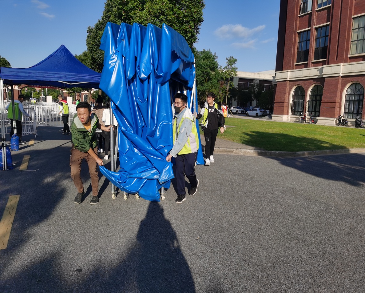 作为校园疫情防控第一道防线的“守门人”,安保服务中心所有人员克服任务重、压力大等困难,在后勤保卫处的统一部署下,除开展迎新前校园重点场所部位的安全检查外,积极配合后勤做好各项迎新保障工作,在学校各园区及校门区域共搭建各类帐篷60余顶、200余个铁马栅栏。分别设立测温组、车辆疏导组、校园巡查组,分工到岗、责任到人。同时,提前对接临港交警、高校派出所协助交通管理和校园秩序维护工作,确保了迎新期间校园周边交通顺畅、报到有序。