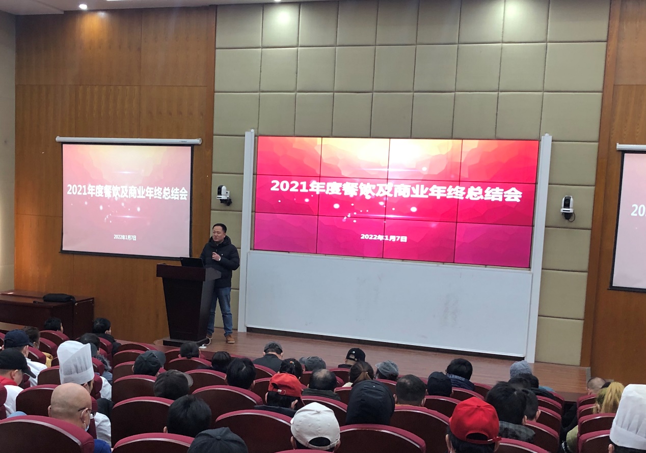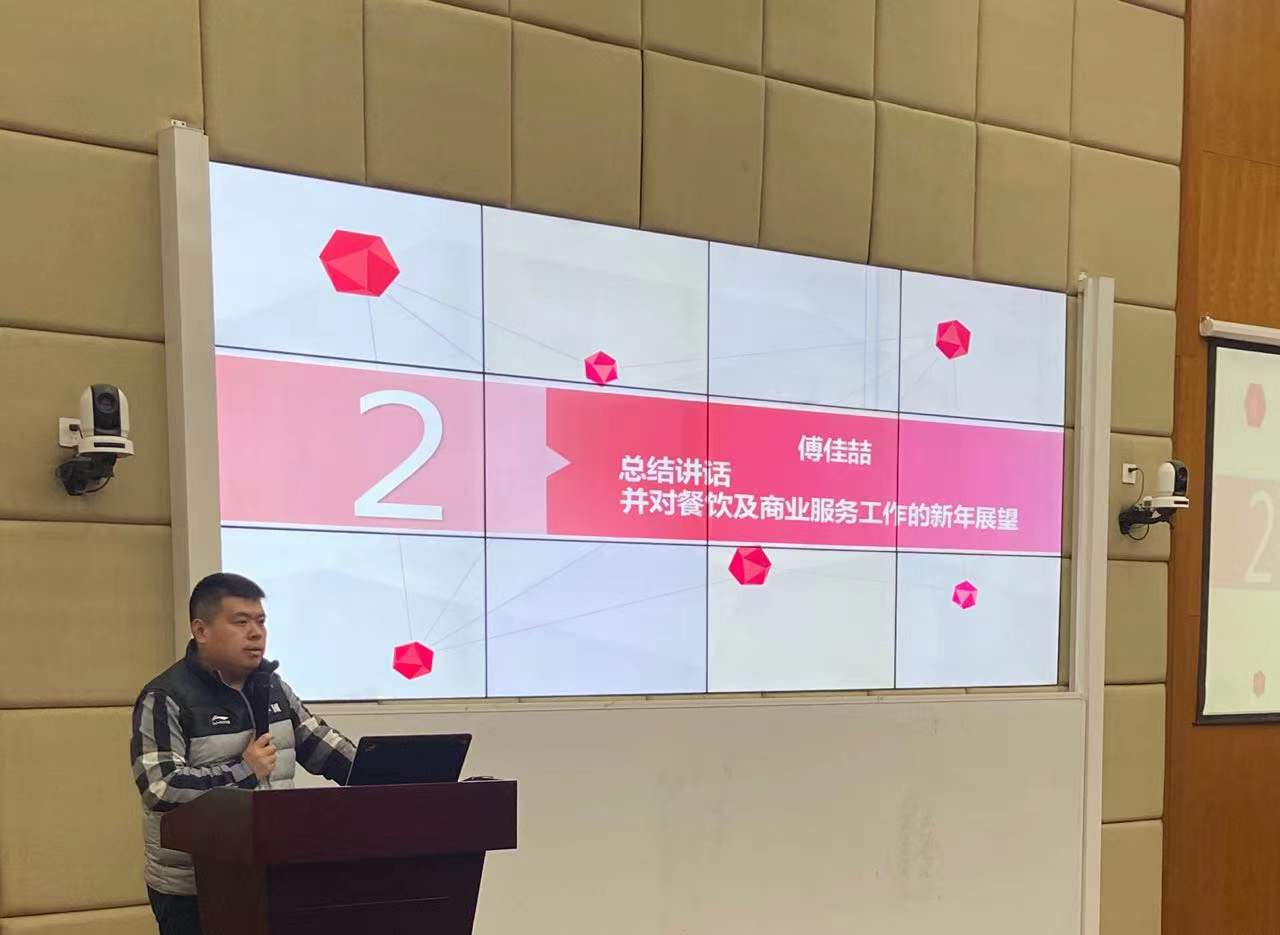 餐饮及商业服务中心副主任陶博对餐饮中心一年以来的重点工作开展情况以及2022年工作计划进行了详细汇报。首先,他对餐饮及商业服务中心360°量化考核过程中存在的问题以及结果、年度考核情况、投诉与处罚情况等做了总结,指出餐饮及商业服务中心在现场管理、员工培训以及管理人员的安全意识等方面还有待进一步加强。其次,他对餐饮及商业服务中心寒假期间相关工作做了安排,并就寒假期间餐饮疫情防控工作做出了明确要求。最后他表示希望餐饮及商业服务中心的工作人员以及各食堂商铺能够在新的一年里携手共进,持续做好餐饮及商业各项服务工作。