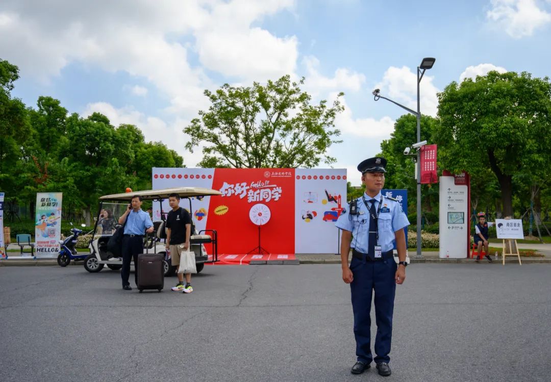 自校门入口处,就有“保安叔叔”与志愿者为大家提供服务,“家长先停车再报到,这边停车场有空位,报到地点在体育馆二楼”、校内随处可见的地点指示牌,让初入校园的新生与家长避免“迷路”,顺利到达场馆完成报到。为了维持报到日校园的交通秩序,后勤保卫处早就针对路段制定了通行方案,在校园里有任何关于通行的问题,找到“保安叔叔”问上一句准没错啦~
