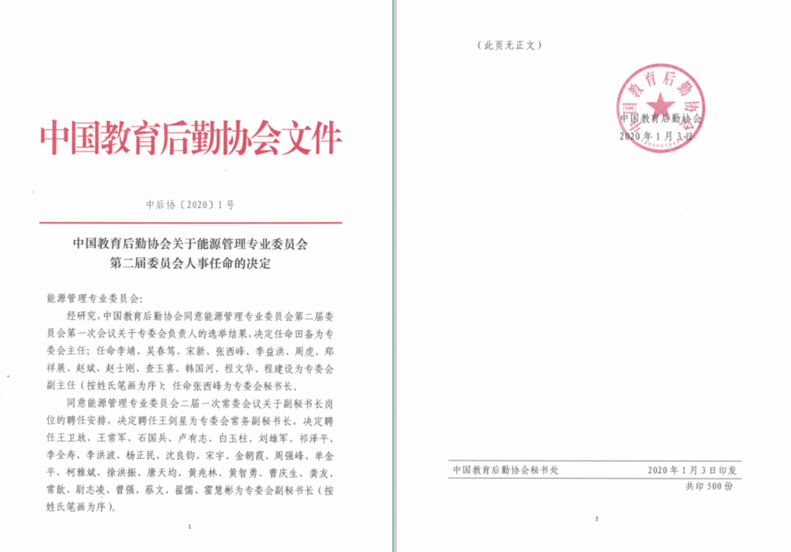 2020年1月3日下午,中国教育后勤协会能源管理专业委员会第二届第一次全体委员大会在北京举行。教育部发展规划司、中国教育后勤协会的相关领导及来自全国各高校的500多名代表参加了本次会议。大会根据《中国教育后勤协会》和《中国教育后勤协会选举办法》的规定,制定了《中国教育后勤协会能源管理专业委员会第二届委员选举办法》,选举产生了委会第二届常务委员、主任、副主任、秘书长、副秘书长。我校副校长郑祥展当选为副主任。