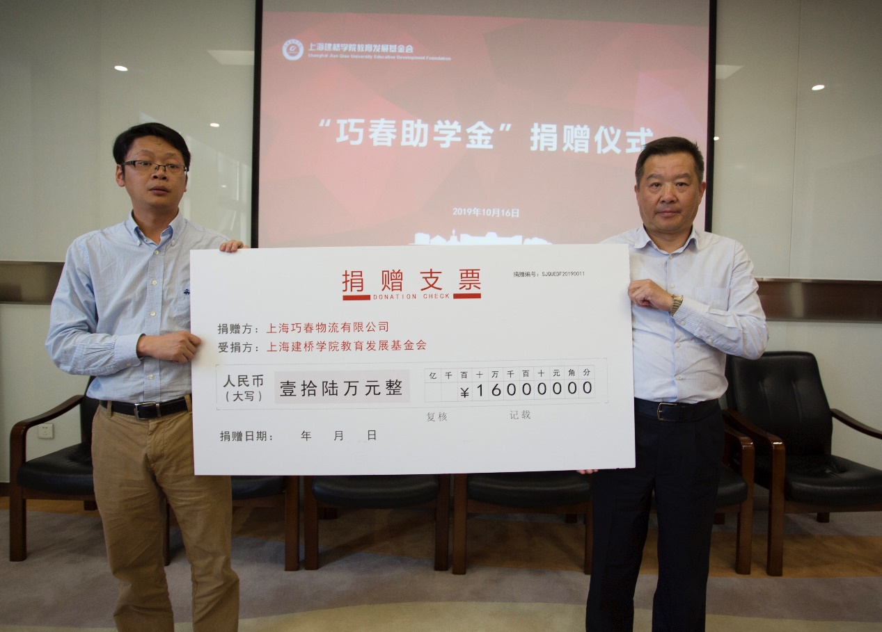 10月16日下午,上海建桥学院教育发展基金会爱心助学金捐赠仪式在图书馆S417举行。基金会名誉理事长、学校董事长周星增出席仪式。基金会秘书长周琦玢主持。基金会理事长王邦永对捐赠代表们表示欢迎及感谢,并向他们介绍了基金会的基本情况。他说,基金会成立的初心就是帮助每一个经济、学业或是心理上有困难的学生顺利完成大学期间的学业,不让一个学生掉队。他表示,基金会将继续做好“建桥”的工作,在困难学生和社会爱心人士之间搭建好桥梁。他勉励同学们,要树立信心、牢记校训、懂得感恩。宋洪杰总经理代表上海巧春物流有限公司向基金会捐赠16万元,设立“巧春助学金”。“巧春助学金”由巧春物流的尚巧云董事长和叶家春总经理夫妇出资,以每人每年2万元的标准资助2名大一贫困学生完成大学四年的学业。上海芝东机电设备有限公司董事长张威向基金会捐赠16万元,设立“芝东助学金”,资助2名贫困学生。上海翔悦汽车销售有限公司总经理李帅向基金会捐赠8万元,设立“翔悦助学金”,资助1名贫困学生。上海奥为建筑节能科技有限公司向基金会捐赠2万元。各位捐赠者同时表示,欢迎同学们去公司参观,也可以为同学们提供勤工俭学的岗位,给予学业和就业上的指导
