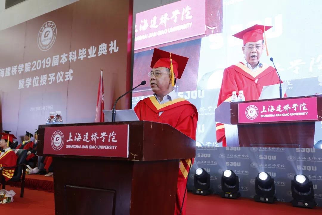 6月29日,我校2019届本科生毕业典礼暨学位授予仪式在学校体育馆隆重举行。董事长周星增,校长朱瑞庭,党委书记江彦桥,副董事长黄清云、蒋威宜,副校长周健儿、郑祥展、夏雨、俞晓光,校长助理、学生处处长陈伟,学校老领导,校学位评定委员会委员,各学院领导,有关职能部门领导,教职工代表、校友代表、家长代表等一起见证建桥学子完成学业开启人生新征程的重要时刻。副校长周健儿主持。典礼仪式在庄严的国歌声中拉开帷幕。各学院院长向校长朱瑞庭汇报毕业人数、获学位人数等,朱瑞庭校长现场宣布并授予相应学士学位。江彦桥书记宣读优秀毕业生表彰决定,179名同学获得上海市优秀毕业生称号,209名同学获得校优秀毕业生称号。校领导分别为为上海市优秀毕业生、校优秀毕业生代表颁奖。党委副书记、副校长、校友总会理事长夏雨宣读校友召集人聘任决定。105名2019届毕业生受聘为校友召集人。毕业生代表汤敬、游颖锋、华晶、蔡泽平朗诵诗歌《心手相牵感恩建桥》回顾大学生活往事,表达了对母校美好的祝福。为更好开启毕业生的新征程,今年起,学校将每年邀请一名在社会中用影响力的人物为毕业生致辞。“强健的体魄是人一生中最宝贵的财富,只有身体好了,我