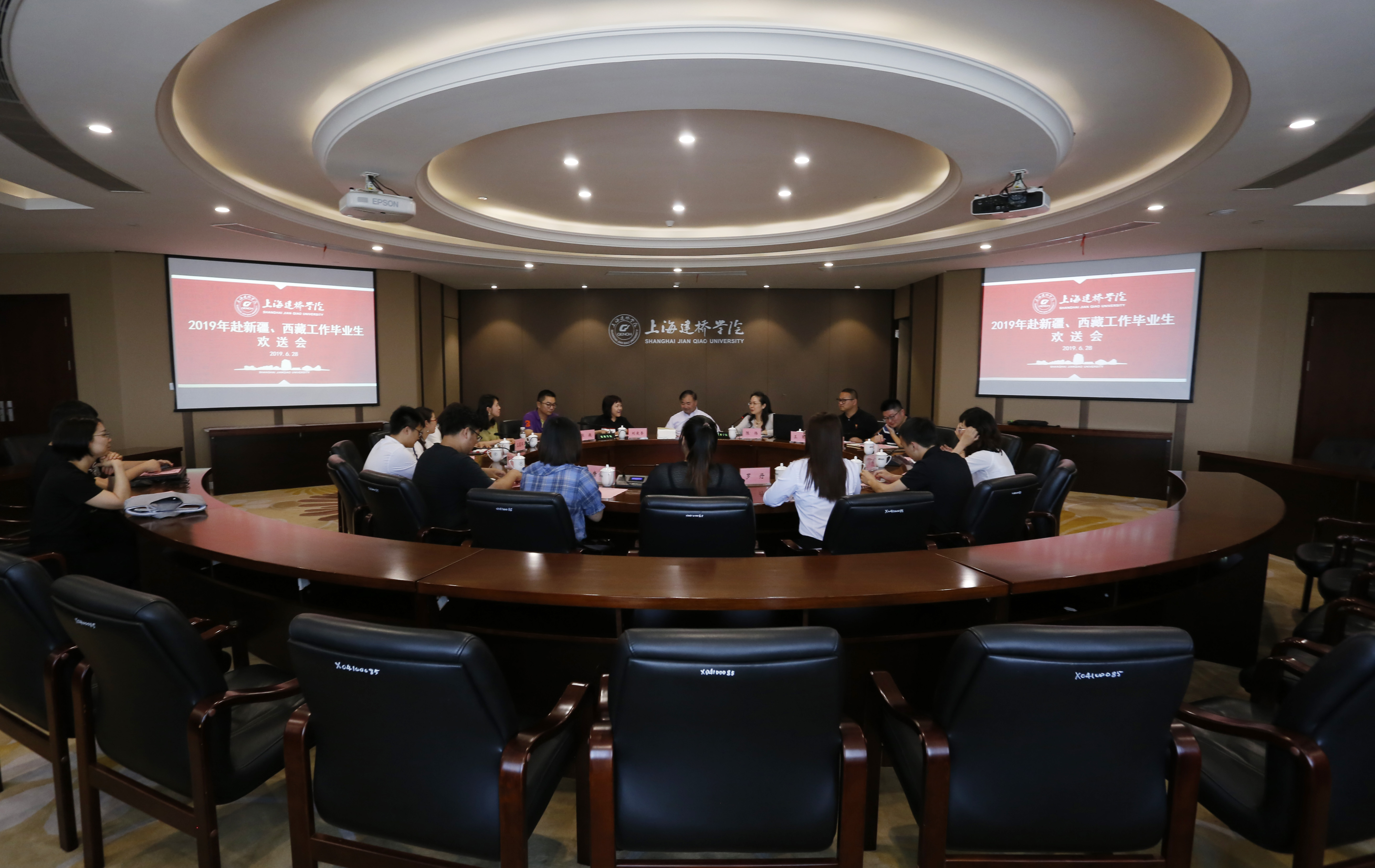 6月28日下午,我校2019届毕业生赴新疆、西藏基层工作表彰欢送会在图书馆M612举行。校党委书记江彦桥,校长助理、学生处处长陈伟,相关职能处室与学院领导,辅导员代表和赴新疆西藏工作的毕业生出席欢送会。陈伟主持本次欢送会。首先,学生处副处长王苇介绍了本年度我校西藏、新疆专招的工作情况。他表示,学校首先成立了专招领导小组和工作小组,第一时间确定工作方案、做好工作部署。同时,在各学院的全力配合下,初步建立了有可能前往西藏、新疆工作的学生信息档案,并以班级辅导员为主、支部书记为辅开展“一对一”政策宣传动员。最终,通过学生自愿报名和学院推荐,通过面试、笔试、体检、政审等环节,我校共有六名学生奔赴新疆、西藏基层工作。来自商学院的毕业生罗丹和信息技术学院的周易将前往西藏基层工作。而新闻传播学院的赵紫冰和唐会会,信息技术学院的蒋安庆和张弛四人将前往新疆。会议期间,现场与已在西藏工作的毕业生吴家铭同学取得了视频通话。吴家铭目前在日喀则市桑珠孜区边雄乡人民政府任扶贫专干。在有限的时间里,他展示了自己的工作环境,并简要介绍了自己平时的主要工作,并十分欢迎学弟学妹的到来,让在场即将奔赴边疆的同学们有了个初步