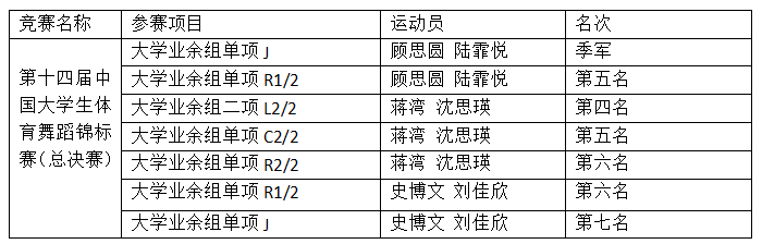 5月10-13日,中国大学生体育协会主办的“第十四届中国大学生体育舞蹈锦标赛(总决赛)”在昆明学院举行。本届锦标赛共有来自全国七十多所高校的八百多名选手参赛,其中不乏体育类、师范类院校的专业选手。我校体育舞蹈队共有6名队员参加了本次大赛,在体育教学部王慧老师的指导下,他们一路过关斩将、奋力拼搏,经过预赛、半决赛和决赛三轮激烈的比赛,取得了以下优异成绩:值得欣喜的是,顾思圆和陆霏悦为我校斩获全国赛的第一枚奖牌,蒋湾和沈思瑛还荣获了大学普通院校组“优秀明星选手”的称号。