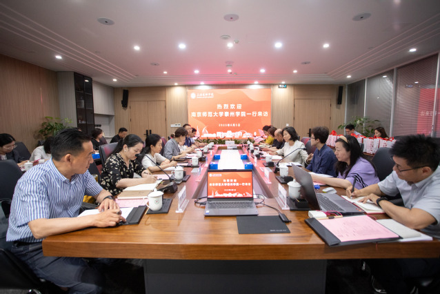 6月5日下午,南京师范大学泰州学院党委常务副书记朱梅一行14人来访,围绕“十五五”规划编制、思政队伍建设、党建工作体系建设、人才引进与教师培养激励机制、师范类与闻传类专业建设等主题开展专题调研。座谈会在行政中心S412会议室举行,校党委副书记夏雨主持会议。夏雨副书记对朱梅副书记一行表示热烈欢迎,介绍了我校的发展历程、办学理念及近年在党建、专业建设、人才培养、社会服务等方面的实践成果。座谈会上,双方就民办高校的转设路径、党建与行政双轨协同运行机制、师范类专业人才培养的路径拓展、新闻传播类专业产教融合模式等内容进行了深入交流。南京师范大学泰州学院相关职能部门及学院负责人围绕调研主题,介绍了学校近年来在内部治理、办学体制改革以及规划制定中的相关做法,并高度评价了我校在治理体系、育人理念、产业学院建设等方面的经验做法。来访一行还参观了学校雷锋馆和国政馆,对学校在文化育人与思政实践方面的深入探索给予充分肯定。本次交流进一步加强了两校之间的互学互鉴,为推动双方高质量发展积累了宝贵经验。